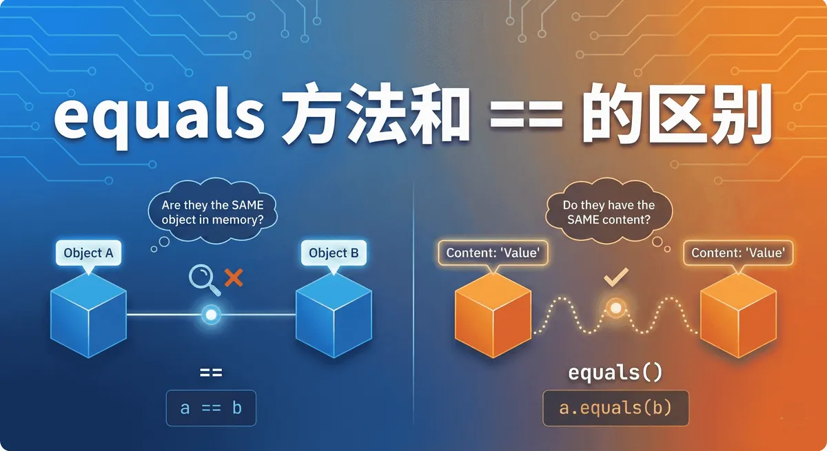 阅读更多 August 22, 2025 equals方法和==的区别 深入理解 Java 中 == 运算符和 equals() 方法的区别,包括基本类型与引用类型的比较机制,以及 String、Integer 类中 equals 方法的重写实现。 Java学习笔记